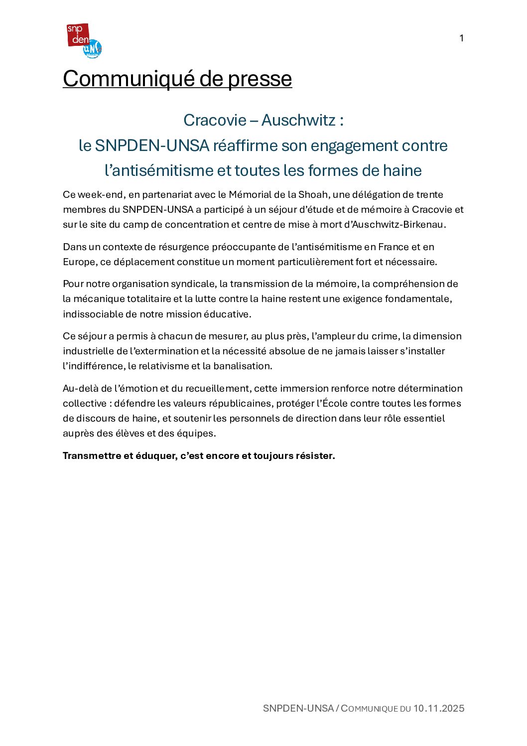 Cracovie – Auschwitz : le SNPDEN-UNSA réaffirme son engagement contre l’antisémitisme et toutes les formes de haine | 10.11.2025