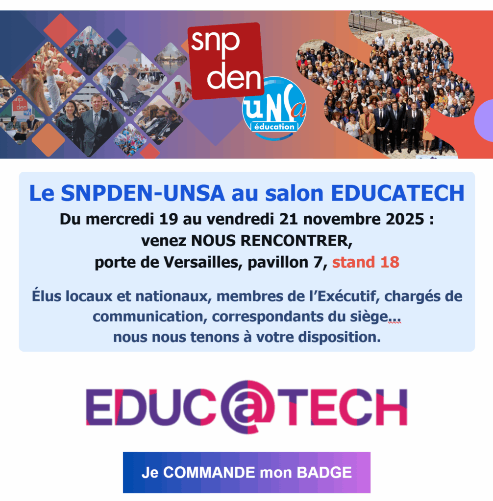 Le SNPDEN-UNSA est présent au salon Educ@tech du mercredi 19 au vendredi 21 novembre 2025.
